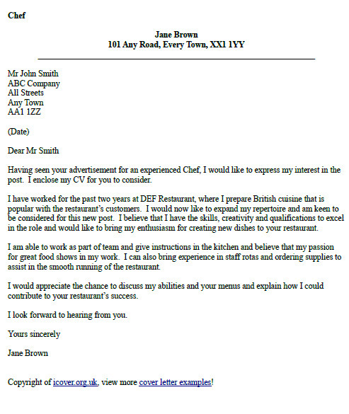 When writing a cover letter, be sure to reference the requirements listed in the job description. Oct 12, 2020 · chef cover letter example. Application for the position of chef. Aug 17, 2014 · customize this letter. The main function of a cover letter is to provide the following information to employers: My experience aligns well with the qualifications you are seeking at matthieu's famille. A chef is confident in the kitchen, and takes charge by delegating specific duties to his kitchen staff in order to keep things running smooth. For writing tips, view this sample cover letter for a chef, or download the chef cover letter template in word. Jun 03, 2021 · chef cover letter sample (text) jayson adamson 24 north road, aspen, co 88758 jayad@emple.com cell: I'd like to express my interest in the chef position you posted at your restaurant. In your letter, reference your most relevant or exceptional qualifications to help employers see why you're a great fit for the role. Dear sir/madam, i would like to express my interest in the chef position at la via restaurant in paris as it would be a great opportunity for me to apply my expertise. Dec 08, 2017 · to be considered for top chef jobs, your cover letter must demonstrate your skills and experience, as well as your passion for your work.
